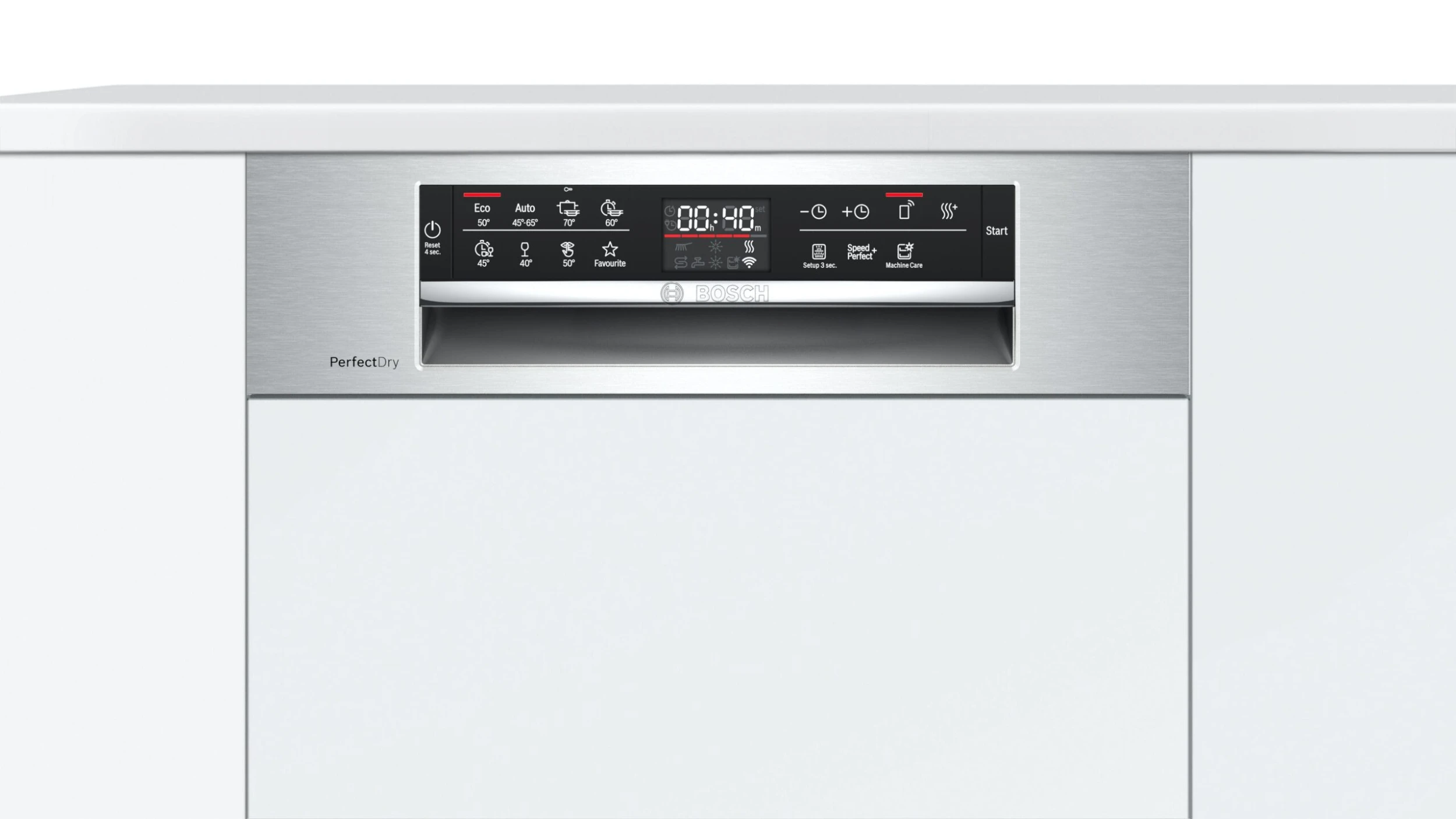 Bosch Serie 6 SPI6ZMS35E. Geräteplatzierung: Halb integriert, Produktgröße: Single (45 cm breit), Bedienfeld Farbe: Edelstahl. Anzahl Maßgedecke: 10 Maßgedecke, Lärmemissionsklasse: B, Geräuschpegel: 43 dB. Höhenverstellbare Füße: 6 cm. Energieeffizienzklasse: C, Wasserverbrauch pro Zyklus: 9,5 l, Energieverbrauch für 100 Zyklen: 59 kWh. Breite: 448 mm, Tiefe: 573 mm, Höhe: 815 mm