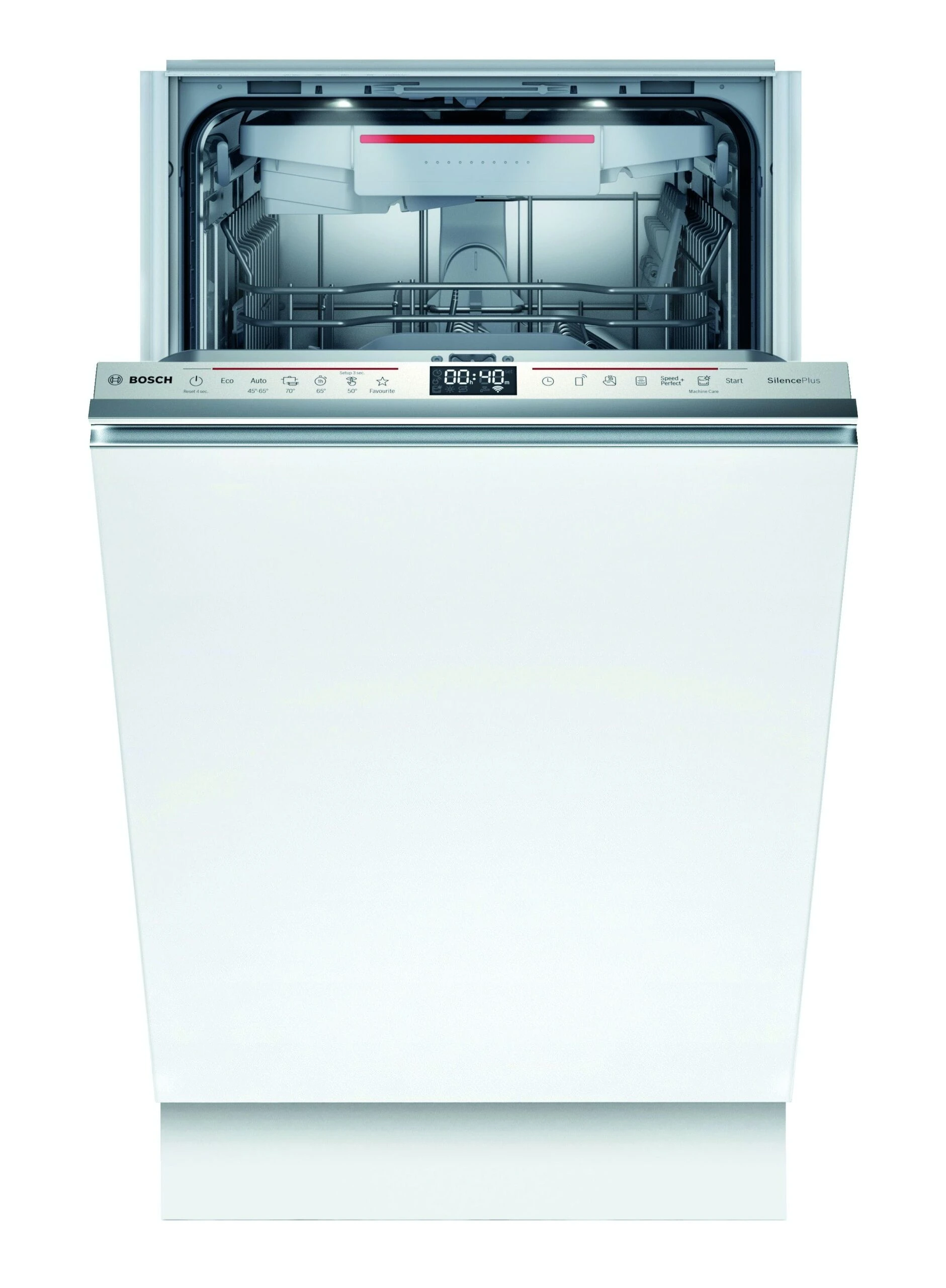 Bosch Serie 6 SPV6EMX11E. Geräteplatzierung: Voll integriert, Produktgröße: Single (45 cm breit), Bedienfeld Farbe: Grau. Anzahl Maßgedecke: 10 Maßgedecke, Lärmemissionsklasse: B, Geräuschpegel: 44 dB. Höhenverstellbare Füße: 6 cm, Control Apps werden unterstützt: Bosch Home Connect. Energieeffizienzklasse: D, Wasserverbrauch pro Zyklus: 9,5 l, Energieverbrauch für 100 Zyklen: 67 kWh. Breite: 448 mm, Tiefe: 550 mm, Höhe: 815 mm